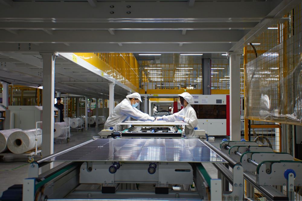 在安徽省滁州市鳳陽(yáng)縣一家光伏企業(yè)內(nèi),工人在生產(chǎn)線上忙碌(2023年6月14日攝)。