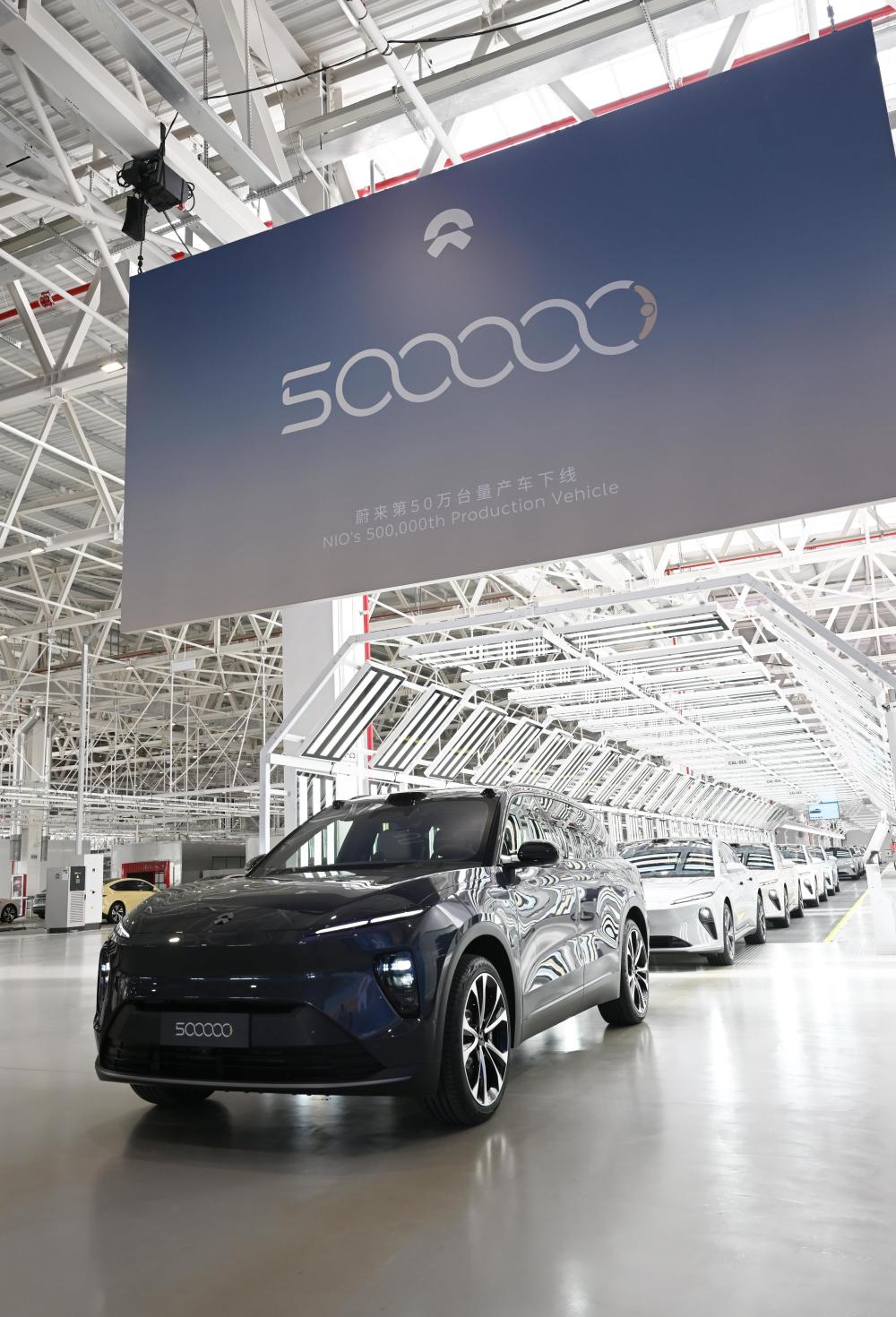 在安徽省合肥市新橋智能電動(dòng)汽車產(chǎn)業(yè)園蔚來合肥第二工廠,蔚來第50萬(wàn)臺(tái)量產(chǎn)車下線(2024年5月9日攝)。