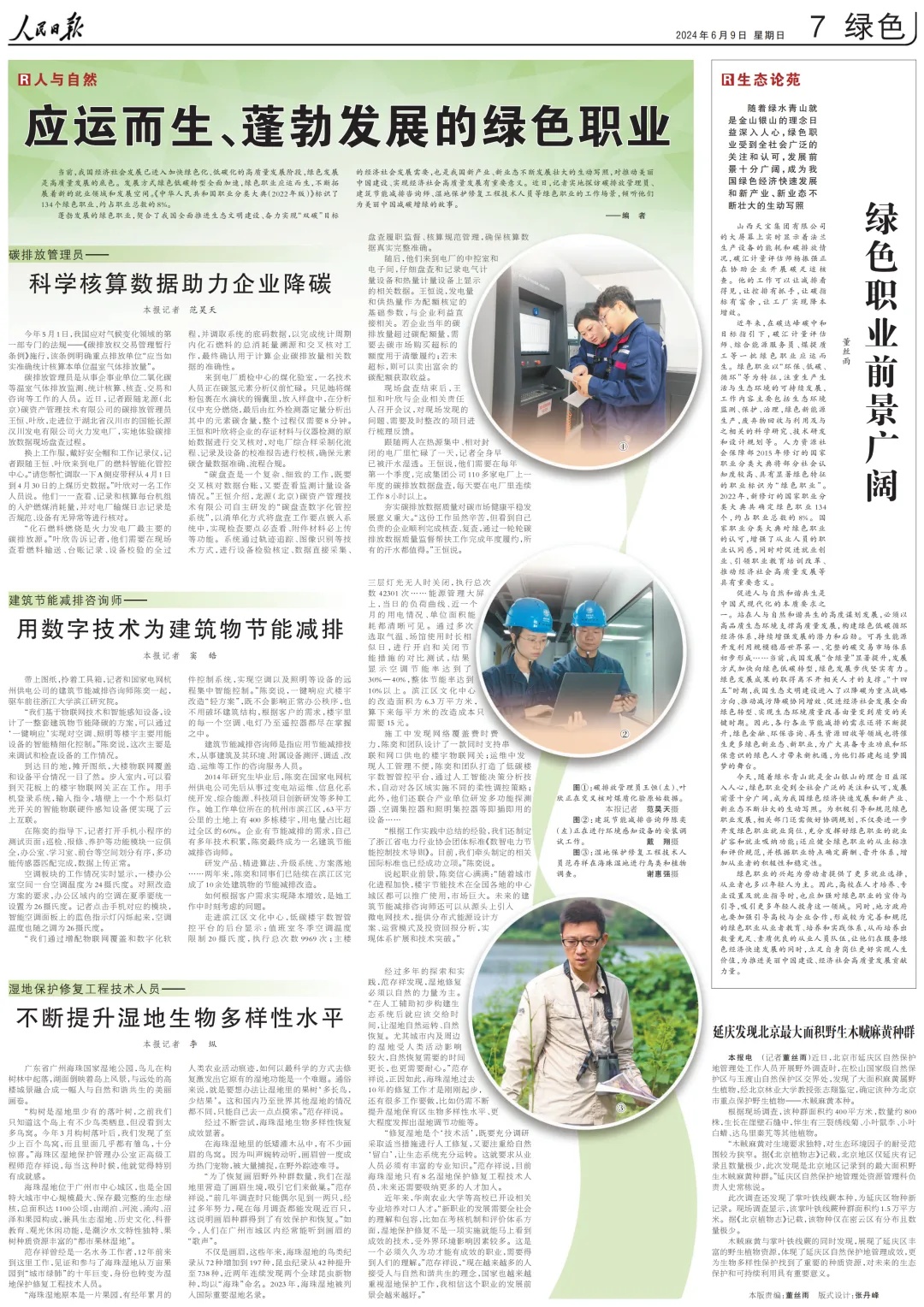 蓬勃發(fā)展的綠色職業(yè),契合了我國全面推進(jìn)生態(tài)文明建設(shè)、奮力實(shí)現(xiàn)“雙碳”目標(biāo)的經(jīng)濟(jì)社會(huì)發(fā)展需要,也是我國新產(chǎn)業(yè)、新業(yè)態(tài)不斷發(fā)展壯大的生動(dòng)寫照,對推動(dòng)美麗中國建設(shè)、實(shí)現(xiàn)經(jīng)濟(jì)社會(huì)高質(zhì)量發(fā)展有重要意義。近日,人民日報(bào)記者實(shí)地探訪碳排放管理員、建筑節(jié)能減排咨詢師、濕地保護(hù)修復(fù)工程技術(shù)人員等綠色職業(yè)的工作場景,傾聽他們?yōu)槊利愔袊鴾p碳增綠的故事。