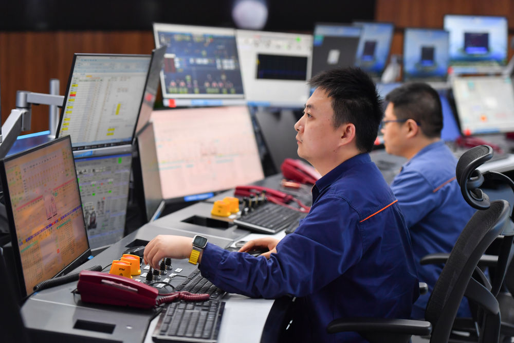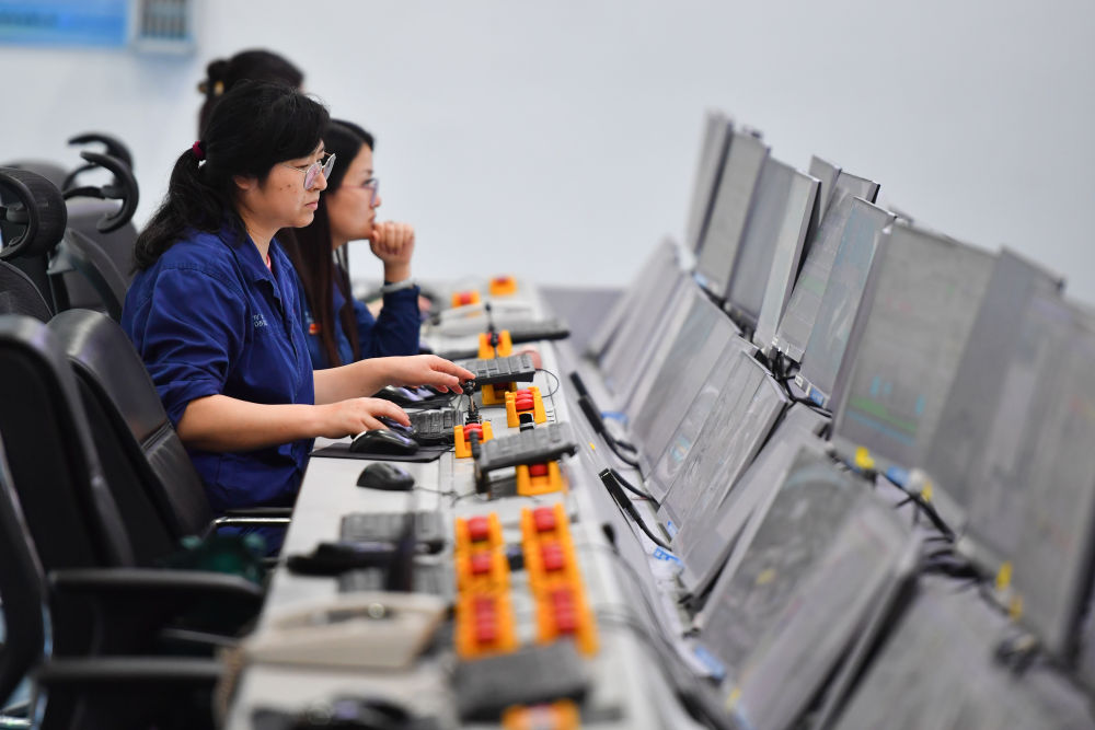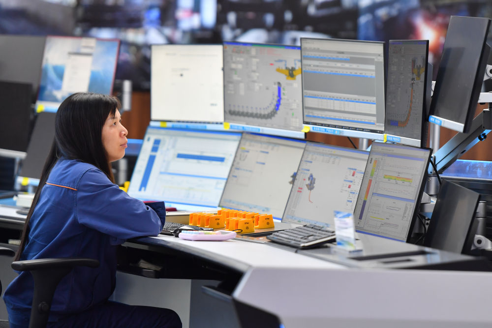2024年6月13日,在位于湖南省湘潭市的湘潭鋼鐵集團(tuán)有限公司五米寬厚板廠智慧中心,工作人員在遠(yuǎn)程操作加熱爐設(shè)備。五米寬厚板廠智慧中心利用超融合、虛擬化、5G傳輸以及分布式計(jì)算和存儲(chǔ)等技術(shù),將五米板煉鋼、軋鋼和熱處理全工序的控制和二級(jí)、三級(jí)系統(tǒng)進(jìn)行整合,改善工人的工作環(huán)境,提高生產(chǎn)的自動(dòng)化程度和效率。新華社記者 陳澤國 攝