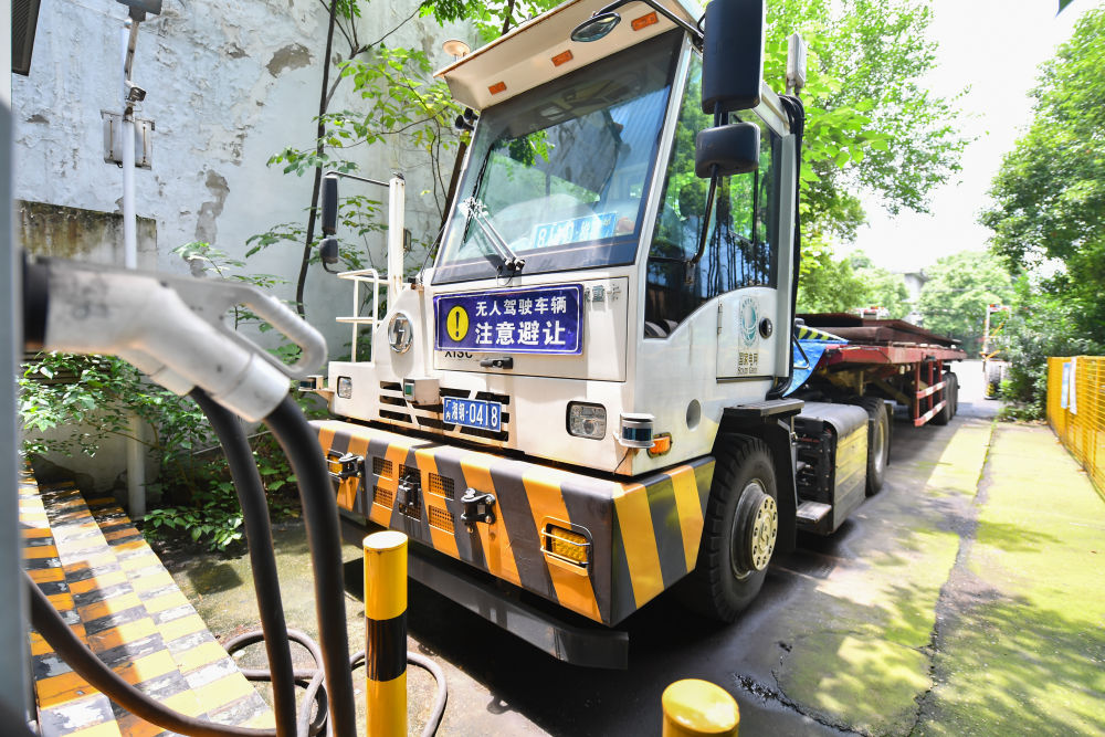 2024年6月13日,在湖南省湘潭市,一臺(tái)碼頭無人牽引車停靠在湘潭鋼鐵集團(tuán)有限公司的充電站。碼頭無人牽引車?yán)?G通信和北斗定位技術(shù),結(jié)合激光雷達(dá)和相機(jī)等傳感器對(duì)周圍的環(huán)境進(jìn)行動(dòng)態(tài)的高精度建模,實(shí)時(shí)獲取牽引車與掛車的相對(duì)位置信息和環(huán)境信息。 新華社記者 陳澤國 攝