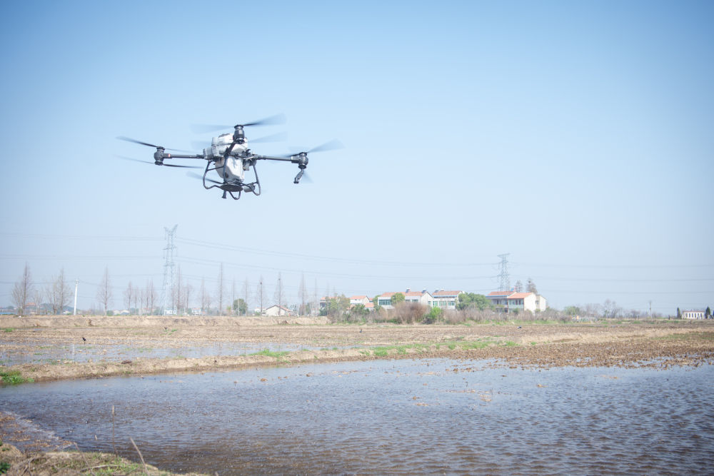 2023年3月15日,在湖北省武漢市黃陂區(qū)胡港灣村,武漢永旺農(nóng)產(chǎn)品專業(yè)合作社的植保無人機(jī)在播撒谷種。 新華社記者 伍志尊 攝