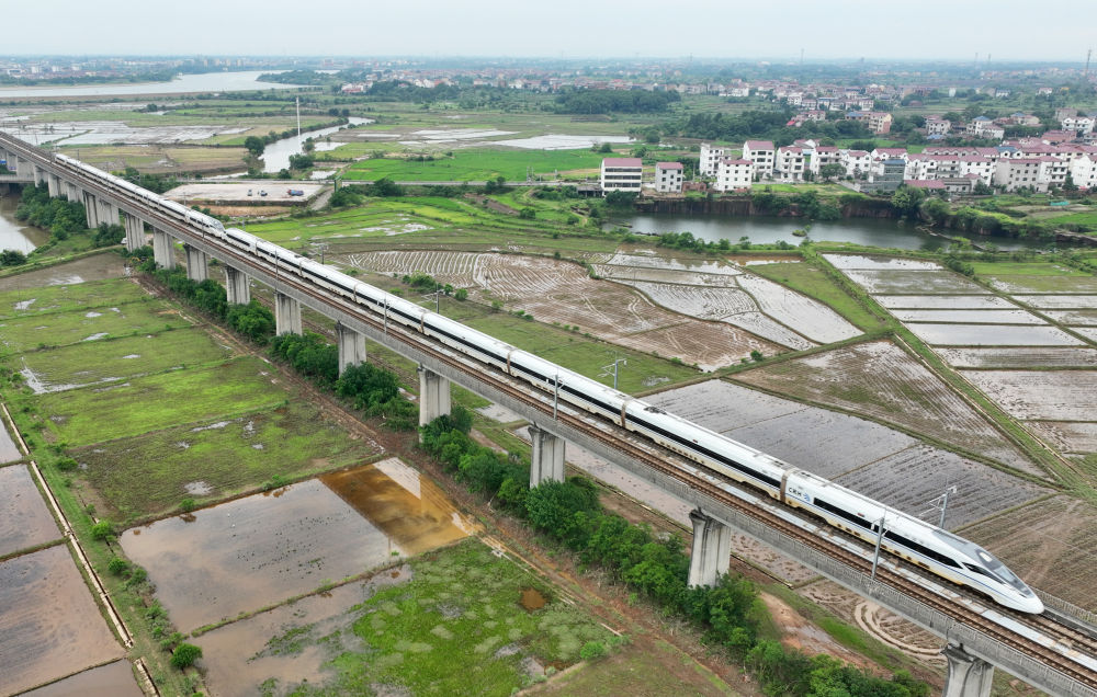 一輛高鐵列車(chē)從位于江西省鷹潭市的田野間駛過(guò)(無(wú)人機(jī)照片,6月4日攝)。新華社記者 萬(wàn)象 攝
