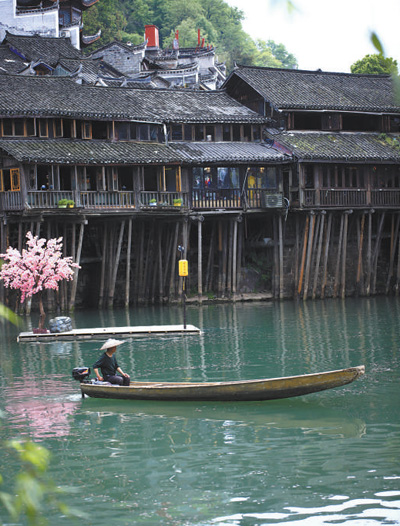 湖南湘西土家族苗族自治州鳳凰古城的吊腳樓沿沱江而建,鱗次櫛比,錯落有致。古色古香的建筑通風防潮,避暑御寒,極具工藝審美和文物研究價值。圖為鳳凰古城吊腳樓一瞥。