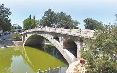 始建于隋代的趙州橋位于河北石家莊市趙縣,是世界上現(xiàn)存年代久遠、跨度最大、保存最完整的單孔坦弧敞肩石拱橋。圖為趙州橋近景。