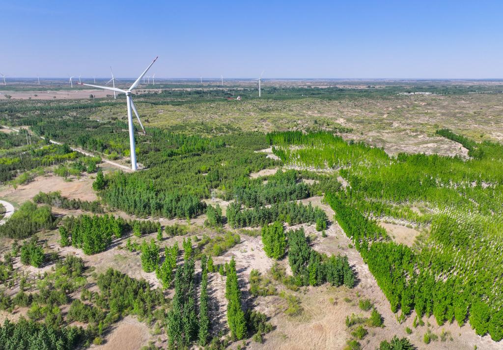 這是在內(nèi)蒙古通遼市科爾沁沙地“雙百萬畝”綜合治理工程努古斯臺項目區(qū)拍攝的風(fēng)力發(fā)電機組(2024年5月15日攝,無人機照片)。新華社記者 連振 攝