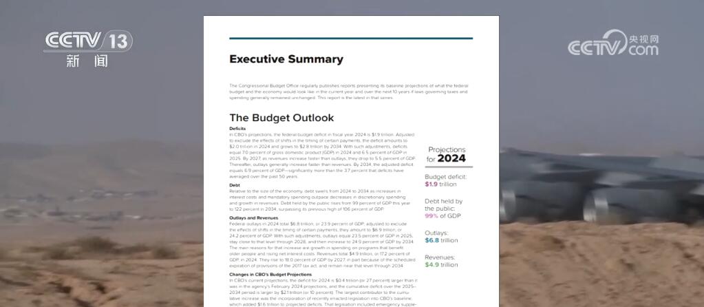 美國國會預(yù)算辦公室18日發(fā)布報告稱,在2024財年,聯(lián)邦政府預(yù)算赤字預(yù)計將達(dá)到1.9萬億美元。