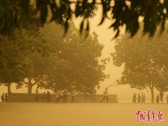 這時(shí)候,學(xué)生們?nèi)哉驹诓賵?chǎng)上說(shuō)話,上課鈴響了,才慢慢踱回樓里。學(xué)校外面,路邊的人就坐在沙霧里吃燒烤,出租車(chē)大敞著窗戶(hù)載客,騎電動(dòng)車(chē)的人偶爾瞇起眼睛,沙子打得臉疼,也絕不戴口罩。之后,人們像掃雪一樣,耐心地掃去門(mén)口、窗臺(tái)上的沙土。