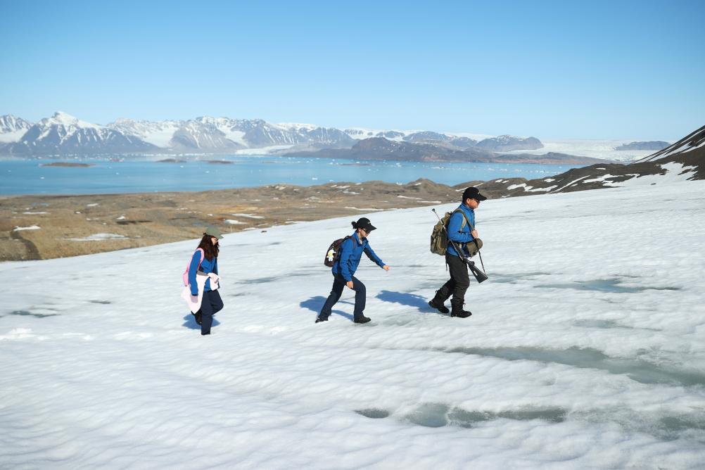 圖為2024年6月22日,在挪威新奧勒松,科考隊員胡正毅(右)、趙紅穎(中)、武小涵外出進行采樣工作。(新華社記者趙丁喆攝)