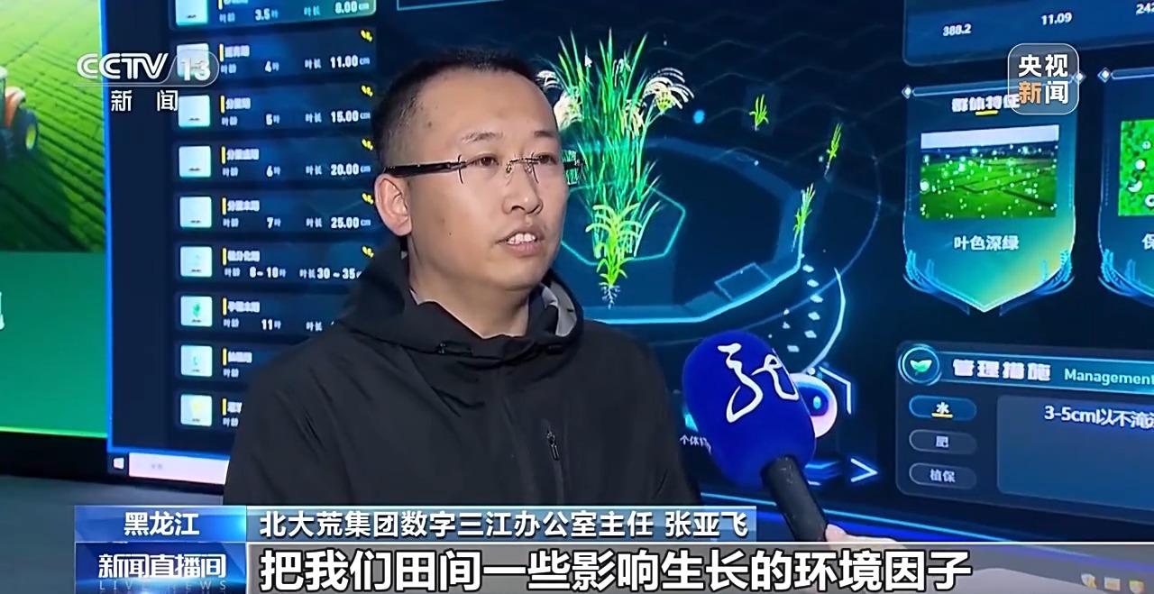 北大荒集團數(shù)字三江辦公室主任 張亞飛:通過無人機群把我們田間的一些影響生長的環(huán)境因子采集回來,然后輸入到我們的大模型之內(nèi),采取的手段是空、天、地、人機一體化的感知手段,形成當(dāng)時、當(dāng)季需要進行的農(nóng)事活動的決策指令,通過這個數(shù)字生產(chǎn)模型來指導(dǎo)我們的種植戶更加科學(xué)地進行種植,提高水稻單產(chǎn)。