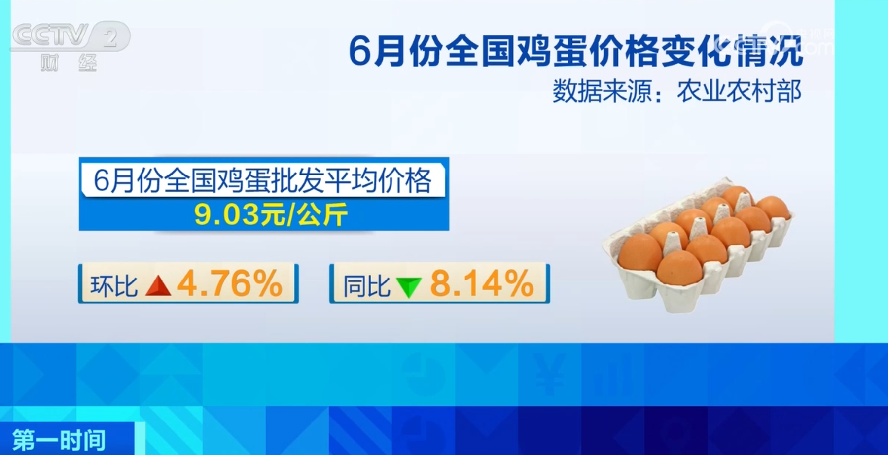 據農業(yè)農村部監(jiān)測,6月份全國雞蛋批發(fā)平均價格為每公斤9.03元,環(huán)比上漲4.76%,同比下降8.14%。