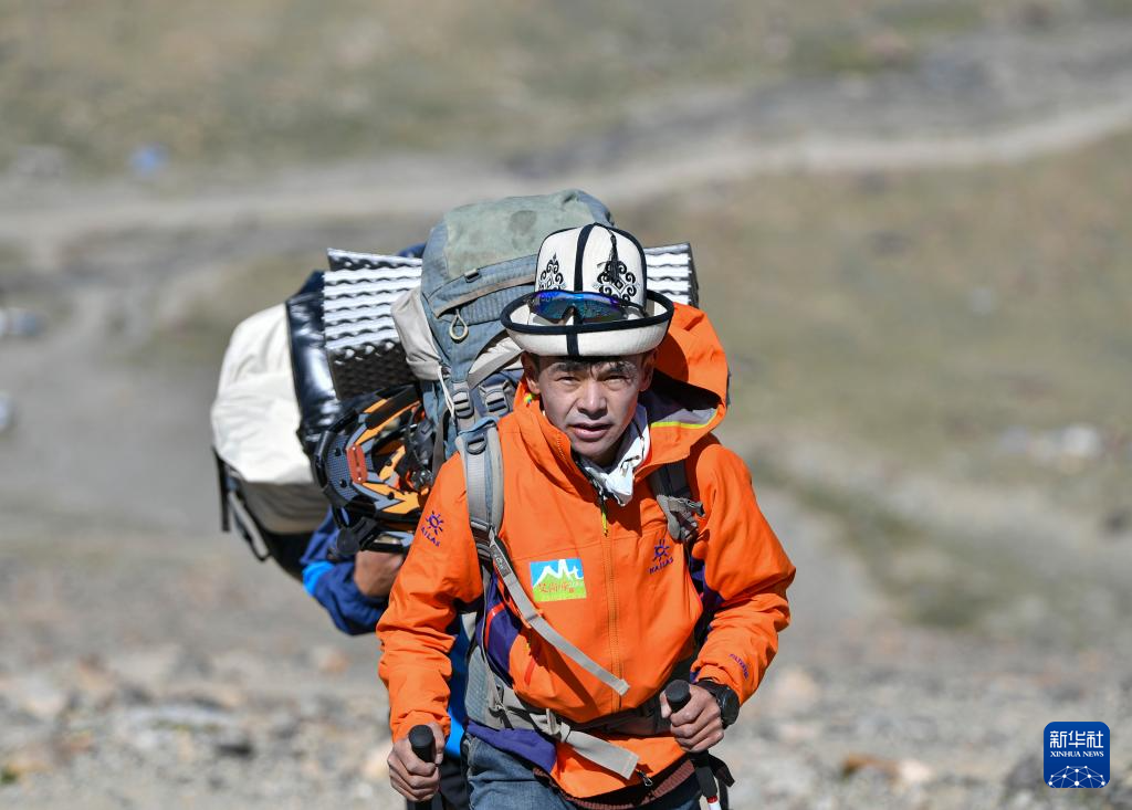 7月4日,塔西巴伊(左二)背著約25公斤的物品和同伴一起行進在慕士塔格峰的山坡上。新華社記者 胡虎虎 攝