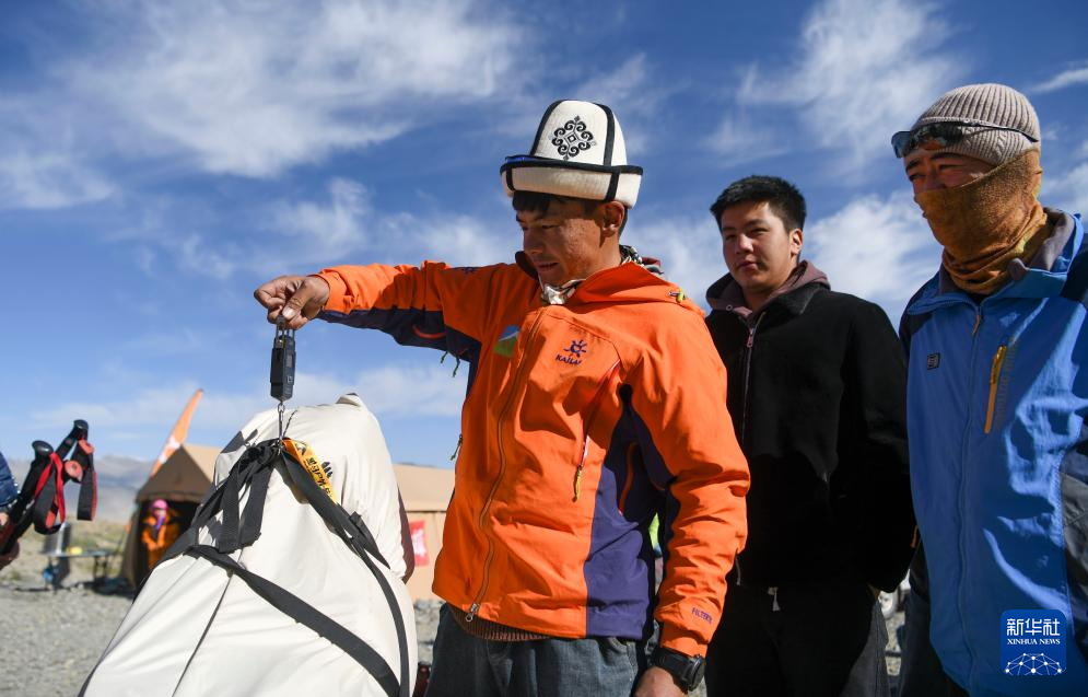 7月4日,在新疆慕士塔格峰一處登山營地,塔西巴伊(左)將登山者的物品稱重。高山搬運依據(jù)不同海拔路程對所背物品按重量收取費用。新華社記者 胡虎虎 攝