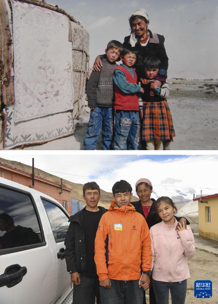 拼版照片:上圖為國外登山隊于2007年8月22日為塔西巴伊(前中)、哥哥(前左)、妹妹(前右)、母親在慕士塔格峰下牧場氈房旁拍攝的合影(7月5日翻拍資料照片);下圖為2024年7月5日塔西巴伊(前中)、哥哥(前左)、妹妹(前右)、母親在慕士塔格峰下新居前拍攝的合影(新華社記者胡虎虎攝)。新華社發(fā)