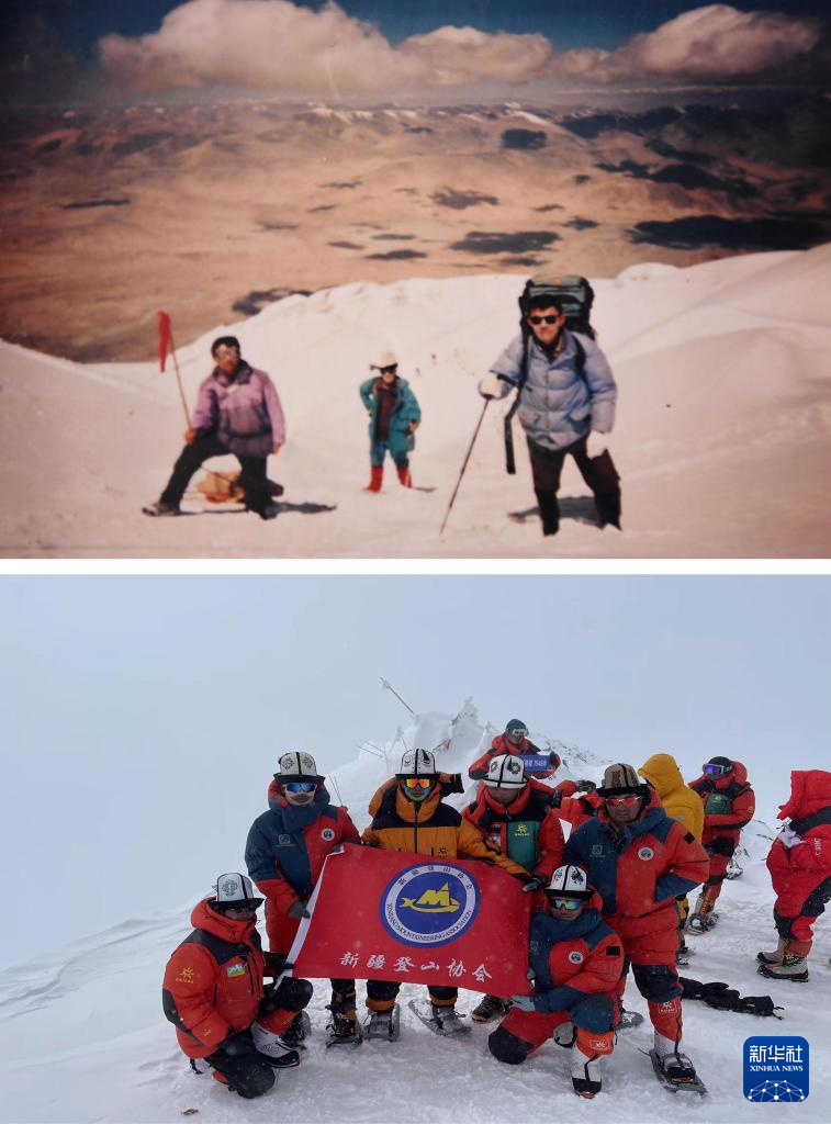 拼版照片:上圖為父親加尼拜克(左)與其兄弟于2004年8月6日一起為國外登山隊服務(wù)時在慕士塔格峰上的合影(2024年7月5日翻拍資料照片,新華社記者胡虎虎攝);下圖為兒子塔西巴伊(左三、黃衣者)和同伴于2023年7月29日登頂慕士塔格峰時的合影(受訪者供圖)。新華社發(fā)