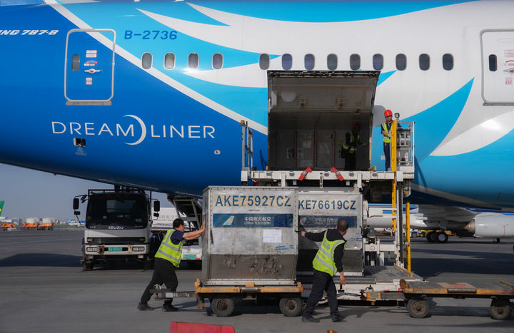 南航工作人員在烏魯木齊地窩堡國(guó)際機(jī)場(chǎng)裝卸國(guó)際航班貨物(2024年4月28日攝)。新華社發(fā)(車捷 攝)
