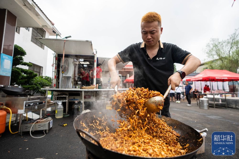 7月8日,在岳陽市良心堡鎮(zhèn)望君洲村,志愿者在炒制菜肴。新華社記者 陳思汗 攝