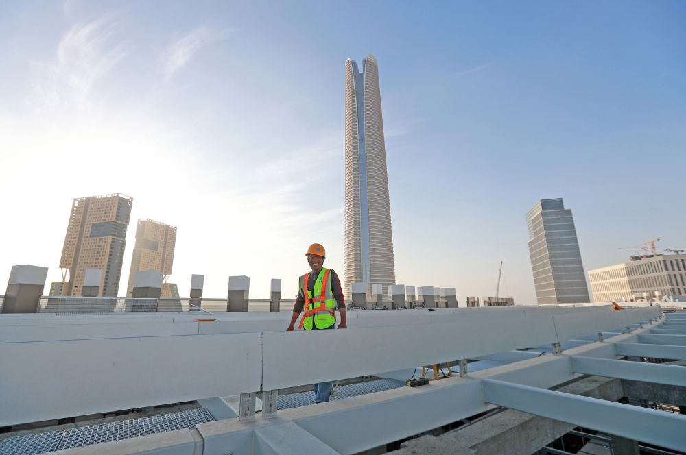 這是2023年11月22日在埃及開(kāi)羅以東的埃及新行政首都中央商務(wù)區(qū)拍攝的一名在高樓樓頂施工的中國(guó)工人。新華社記者隋先凱攝