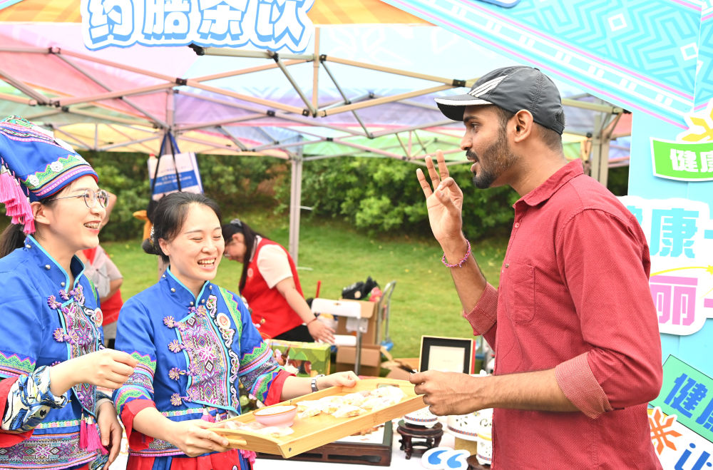 2024年4月11日,一名外國(guó)游客在“廣西三月三·八桂嘉年華”活動(dòng)廣西南寧市青秀山主會(huì)場(chǎng)品嘗美食后做出“OK”手勢(shì)。新華社記者周華攝