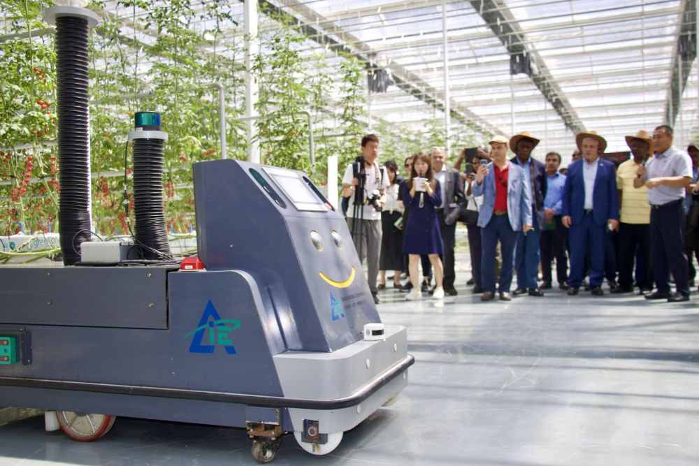 7月12日,駐華使節(jié)走訪鄂爾多斯市達拉特旗德農(nóng)現(xiàn)代高效設(shè)施農(nóng)業(yè)產(chǎn)業(yè)園,觀看巡檢機器人工作。新華社記者 劉嵐?jié)?攝