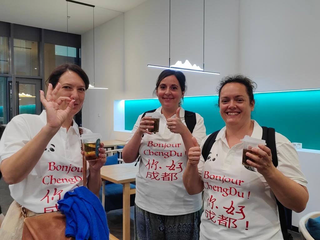 7月13日,在品嘗中藥茶飲后,三名法國中醫(yī)藥愛好者表示非常滿意。新華社記者 董小紅 攝