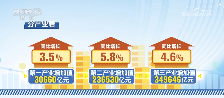 分產(chǎn)業(yè)看,第一產(chǎn)業(yè)增加值30660億元,同比增長3.5%;第二產(chǎn)業(yè)增加值236530億元,增長5.8%;第三產(chǎn)業(yè)增加值349646億元,增長4.6%。分季度看,一季度國內(nèi)生產(chǎn)總值同比增長5.3%,二季度增長4.7%。從環(huán)比看,二季度國內(nèi)生產(chǎn)總值增長0.7%。
