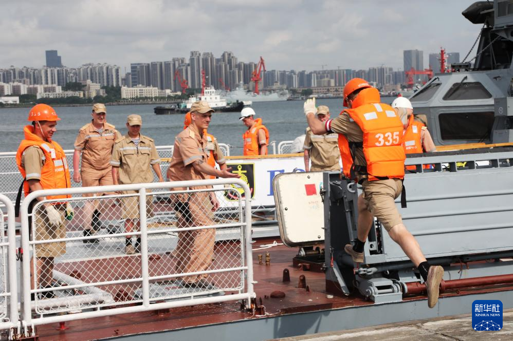 7月15日,俄“響亮”號(hào)護(hù)衛(wèi)艦艦員完成撤跳板工作后返回。新華社記者 黎云 攝