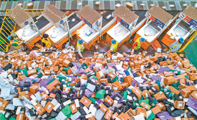 圖為江蘇省宿遷經(jīng)濟技術開發(fā)區(qū)郵政郵件處理中心,工作人員在進行分揀。