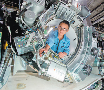 北京經(jīng)濟(jì)技術(shù)開(kāi)發(fā)區(qū)永昌北路1號(hào),通用電氣醫(yī)療北京影像設(shè)備制造基地(以下簡(jiǎn)稱(chēng)“北京生產(chǎn)基地”),生產(chǎn)線上機(jī)器轟鳴,一臺(tái)臺(tái)醫(yī)療器械陸續(xù)完成裝配。通用電氣醫(yī)療在全球銷(xiāo)售的每三臺(tái)CT機(jī)中就有2臺(tái)產(chǎn)自這里,產(chǎn)品銷(xiāo)往全球100多個(gè)國(guó)家和地區(qū)。