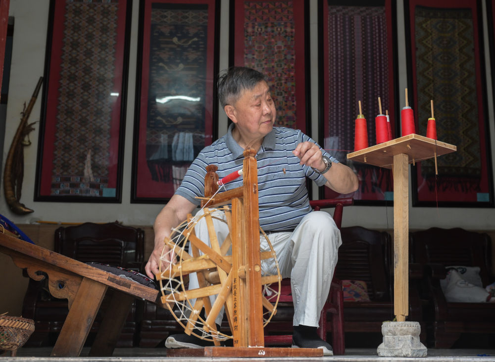 7月3日,湖北省來(lái)鳳縣桂花樹社區(qū),唐洪祥在紡線。
