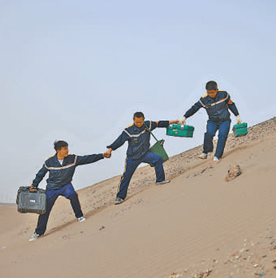班組成員在翻越沙丘。 2014年,烏魯木齊西車輛段哈密動(dòng)態(tài)檢測(cè)車間哈羅班組正式成立,負(fù)責(zé)維護(hù)哈羅鐵路沿線設(shè)備。10年來,哈羅班組堅(jiān)守在環(huán)境惡劣、條件艱苦的羅布泊,克服重重困難,做好鐵路巡檢和故障維修,保障鉀肥運(yùn)輸。 羅布泊,位于新疆東南部塔克拉瑪干沙漠邊緣,天上無飛鳥,地上不長(zhǎng)草,只有漫無邊際的沙漠、戈壁、鹽堿灘。 這里一年中有200多天風(fēng)沙肆虐,夏季氣溫超過50攝氏度,冬季氣溫低至零下30攝氏度。這里是中國鐵路烏魯木齊局集團(tuán)有限公司烏魯木齊西車輛段哈密動(dòng)態(tài)檢測(cè)車間哈羅班組工作的地方。 是什么讓他們選擇到羅布泊工作?又是什么工作值得他們?cè)谶@里堅(jiān)守10年? “鐵路修到哪兒,人員就要配到哪兒” 嗚—— “火車進(jìn)站了,快!” 哈羅班組工長(zhǎng)臺(tái)欣龍和伙伴們沖向站臺(tái),幾個(gè)人一下子堵在了車門前。 “老吳,這回有啥?” “今兒有羊肉、雞蛋,還有一袋子番茄。” “嘿嘿嘿?!?/p> 車門旁,幾個(gè)大小伙兒咧著嘴憨笑。 臺(tái)欣龍工作的地方,叫羅中站,是哈羅鐵路的最后一站,地處羅布泊中心。這里雖通了電、通了水,但米、面、糧、油、飲用水等生活物資全靠火車從400公里外的哈密市送來。 “大小伙兒們,自己搬水。”列車長(zhǎng)老吳一聲令下,臺(tái)欣龍和伙伴們麻利地爬上車,一人扛下一桶15升的礦泉水。 “這兒的水堿性大,一燒開,全是白粒粒,沒法喝?!迸_(tái)欣龍說,這15升礦泉水得撐一周。 在羅中站,差不多每隔5天會(huì)有通勤列車抵達(dá),送來各類物資。 列車停留5小時(shí),隨即返程。羅中站經(jīng)歷短暫的熱鬧后,再次回歸平靜。 除了人少、地荒、物資緊,寂寞、單調(diào)或許是在羅中站工作、生活面臨的最大困難。 這里沒有商店、沒有飯館、沒有影院。白天,手機(jī)還能有網(wǎng)絡(luò)信號(hào),晚上則幾乎沒有信號(hào)。乒乓球、象棋以及少量書籍,為臺(tái)欣龍和伙伴們提供了少有的娛樂方式。 2014年,中國鐵路烏魯木齊局集團(tuán)有限公司烏魯木齊西車輛段哈密動(dòng)態(tài)檢測(cè)車間哈羅班組正式成立,負(fù)責(zé)維護(hù)哈羅鐵路沿線設(shè)備。當(dāng)年,剛畢業(yè)的臺(tái)欣龍來到了這里。 當(dāng)時(shí)也沒想太多,覺得在哪里都是干活,就接受了單位安排。“鐵路修到哪兒,人員就要配到哪兒,這活總得有人干?!迸_(tái)欣龍說。 如今,哈羅班組共有7人,大伙兒隔10天輪一次班。班組里年齡最大的丁鵬今年51歲了,最小的永志帥和杜權(quán)也已31歲。 “假如某個(gè)檢測(cè)站發(fā)出故障警報(bào),無論什么天氣,都必須立即響應(yīng)” 凌晨3時(shí)20分,顛簸了近5個(gè)小時(shí),臺(tái)欣龍和兩名隊(duì)員到達(dá)了黑龍峰動(dòng)態(tài)設(shè)備檢測(cè)站。這里,距離羅中站230公里。 夜間出行,沒有道路、沒有路燈、沒有導(dǎo)航,臺(tái)欣龍駕駛著皮卡車朝著鐵路延伸的方向在茫茫戈壁灘里蹚出路。這一路大坑套小坑,人的腦袋時(shí)不時(shí)頂?shù)杰図?,撞得生疼?/p> 下了車,風(fēng)裹著沙子打在臉上、頭燈上,幾乎掩蓋了說話聲。時(shí)間長(zhǎng)了,臺(tái)欣龍和隊(duì)友們便形成了默契,只需一個(gè)手勢(shì),便知道對(duì)方的意思。 4時(shí)10分,臺(tái)欣龍和隊(duì)友開始作業(yè)。 打開紅外線軸溫探測(cè)設(shè)備(THDS)的機(jī)蓋,映入眼簾的是一層厚厚的沙塵。臺(tái)欣龍熟練地拿出吹風(fēng)機(jī)、毛刷,仔細(xì)清理室外探頭箱里的沙塵,再把黑體(一種檢測(cè)設(shè)備)放置在探頭箱上,進(jìn)行溫度檢測(cè)校準(zhǔn)。 “我們這里夏季溫度高,若列車輪對(duì)軸溫超標(biāo),就有斷軸風(fēng)險(xiǎn),引發(fā)安全事故。檢測(cè)儀器必須保證準(zhǔn)確性。”臺(tái)欣龍解釋,根據(jù)標(biāo)準(zhǔn),THDS低溫檢測(cè)誤差正負(fù)不得超過2攝氏度,高溫時(shí)段不得超過3攝氏度?!暗覀冏约旱囊笫菍⒄`差控制在1攝氏度?!?/p> 早晨7時(shí),臺(tái)欣龍一行結(jié)束檢測(cè)任務(wù),踏上了回程路,直到中午12時(shí)才趕回駐地。 “今天這一路,算順利的。”臺(tái)欣龍說,“假如某個(gè)檢測(cè)站發(fā)出故障警報(bào),無論什么天氣,都必須立即響應(yīng)?!痹诹_布泊,沙塵暴說來就來,一刮就是三四個(gè)小時(shí)。有一回,他們遇上特大沙塵暴,風(fēng)暴像堵墻一樣迎面撲來。越野車迎風(fēng)的一側(cè),車漆幾乎全被風(fēng)沙打掉?!靶姨澑浇凶鶚蚝?,大伙兒在里頭躲了3個(gè)多小時(shí)?!憋L(fēng)暴過后,衣服上、頭發(fā)上、耳朵里、鼻孔里全都是沙子。一抬腳,鐵道路基上的風(fēng)沙已沒過膝蓋。 還有一次,冬季雪夜,臺(tái)欣龍和隊(duì)友們?nèi)ヌ幚砭o急故障。大雪的掩蓋,讓茫茫戈壁更難辨認(rèn)方向?!拔覀円徊恍⌒淖咤e(cuò)了方向,跑了很多冤枉路,最終汽車油料不足,只能請(qǐng)求救援,天亮了才出來。”臺(tái)欣龍說。 “檢修得跟上,為鉀肥運(yùn)輸做好保障” 無水、無人、無城,哈羅鐵路為何要修往羅布泊? 原來,羅布泊寸草不生的地表之下,藏著世界上最大的硫酸鹽型含鉀鹵水礦床,占全國鉀資源量的三成。 長(zhǎng)期以來,我國耕地面積中一半以上缺鉀,偏偏鉀鹽在我國屬稀缺礦種,農(nóng)民此前用的鉀肥,85%以上依賴進(jìn)口。羅布泊的發(fā)現(xi