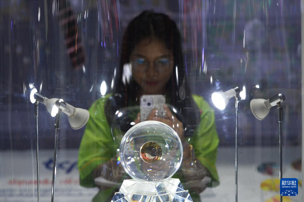 7月23日,一名女子在泰國(guó)曼谷舉行的“2024泰國(guó)未來科學(xué)力量展覽會(huì)”上拍攝展出的嫦娥五號(hào)月壤樣品。新華社發(fā)(拉亨攝)