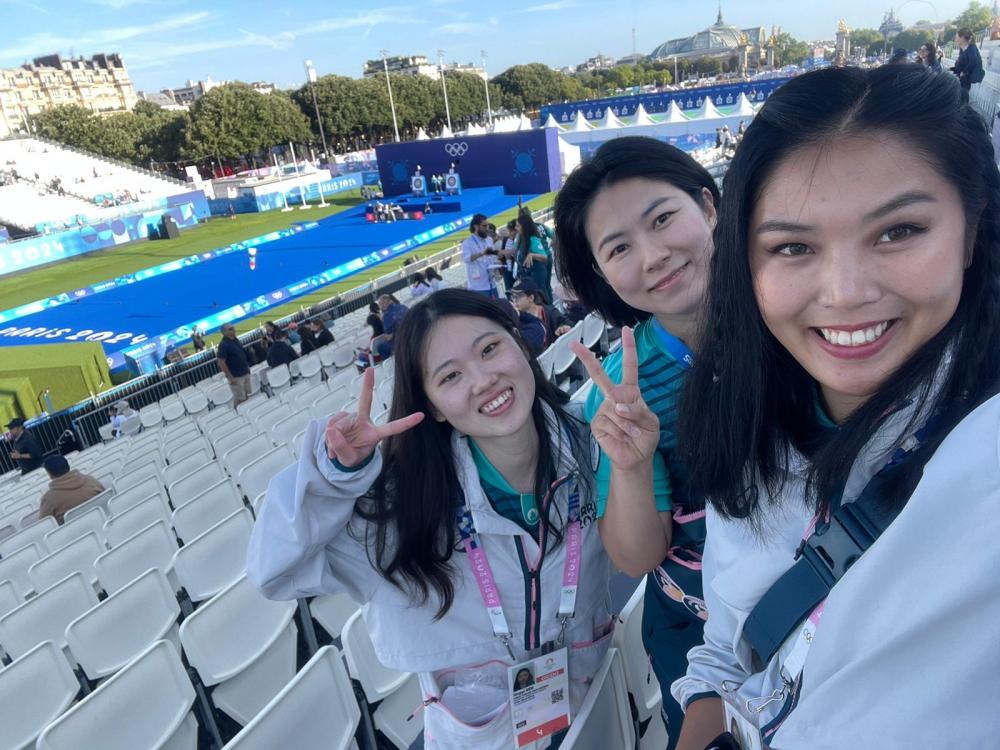 7月28日,中國志愿者任警怡(左一)和韓國志愿者(左二)、日本志愿者(右一)在巴黎奧運(yùn)會射箭項(xiàng)目場地。(受訪者供圖)