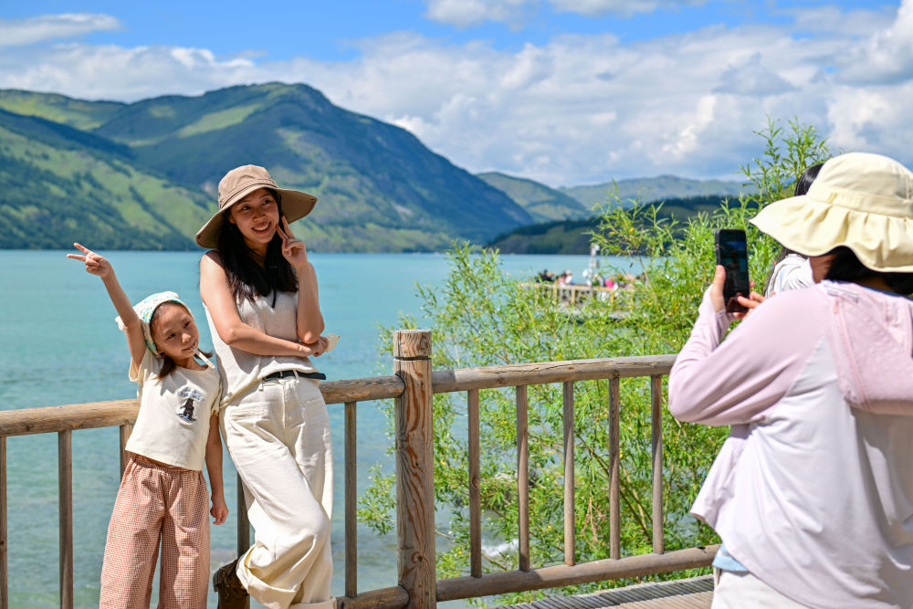 游客在新疆阿勒泰地區(qū)喀納斯景區(qū)觀光游覽(7月22日攝)。