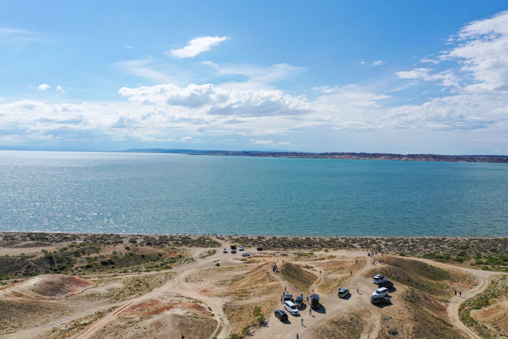 游客在新疆阿勒泰地區(qū)福海縣烏倫古湖觀光游覽(7月21日攝)。