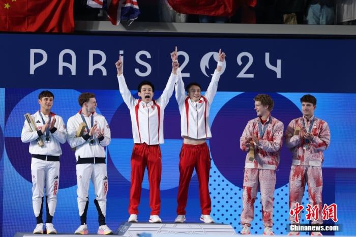當(dāng)?shù)貢r(shí)間7月29日,在巴黎奧運(yùn)會(huì)跳水男子雙人十米臺(tái)決賽中,中國選手練俊杰/楊昊奪得金牌。圖為頒獎(jiǎng)儀式。中新社記者 富田 攝