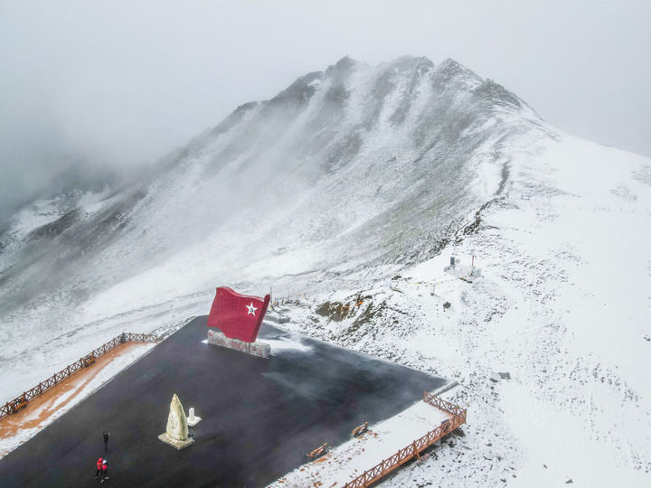 這是位于四川夾金山海拔4114米埡口的紅色主題文化景觀(2021年5月12日攝,無人機照片)。新華社發(fā)(郝立藝 攝)