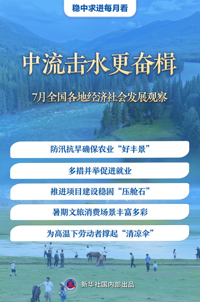 7月是下半年經(jīng)濟運行開局的關(guān)鍵時段。防汛抗旱應對極端天氣挑戰(zhàn),促就業(yè)推出新舉措,重大項目壓茬推進……行至年中,各地凝聚力量,奮楫前進,不斷增進民生福祉,更好地推動高質(zhì)量發(fā)展。