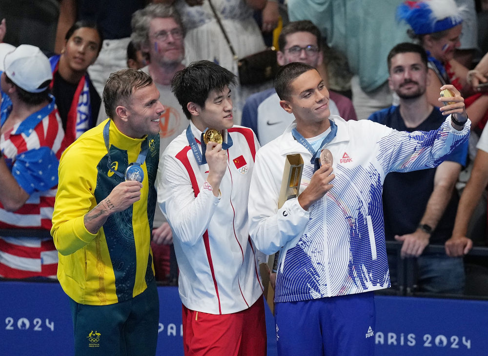 ↑冠軍中國選手潘展樂(中)、亞軍澳大利亞選手查默斯(左)與季軍羅馬尼亞選手波波維奇在頒獎儀式上。新華社記者 雒圓 攝