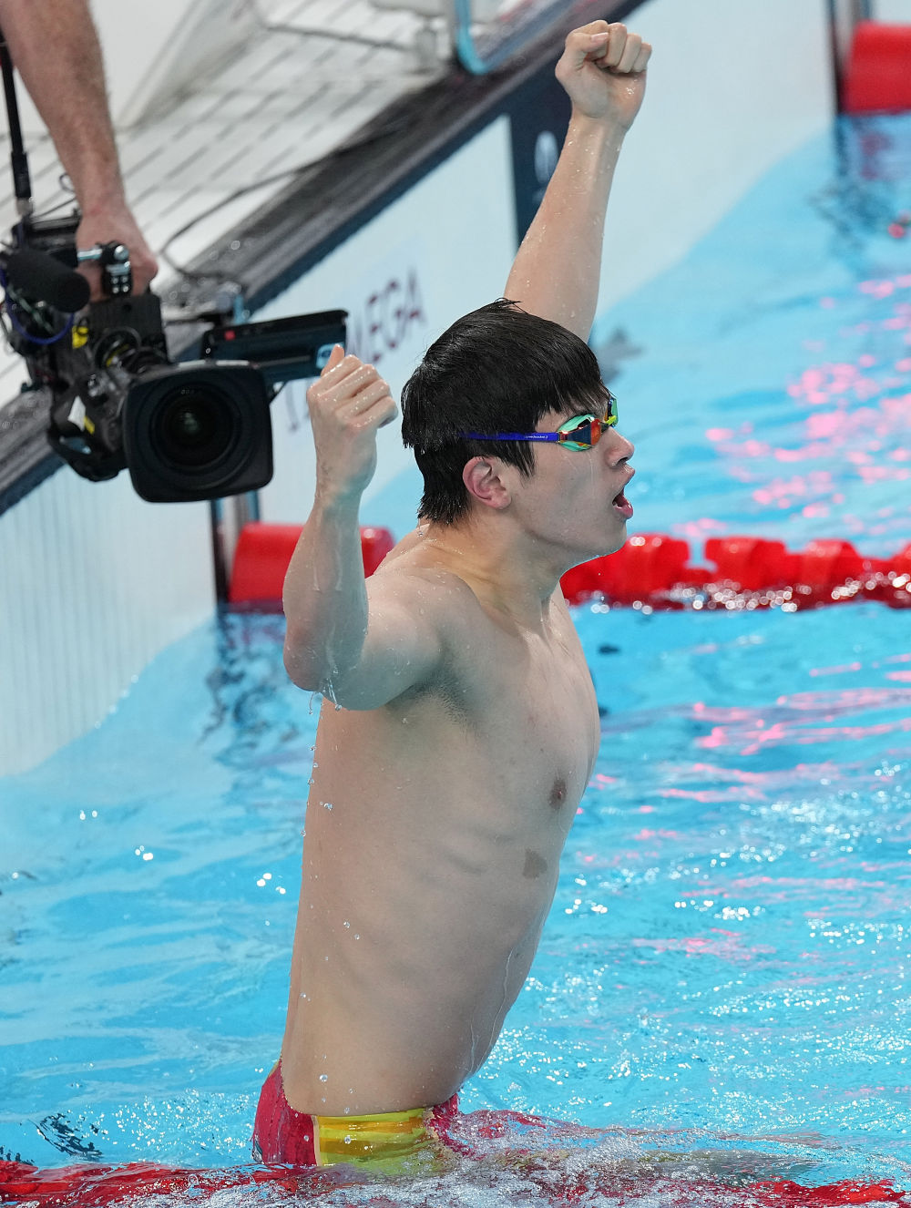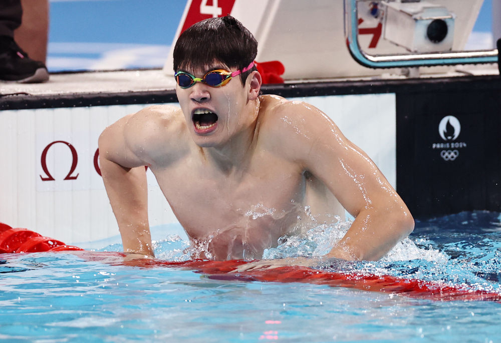 ↑中國選手潘展樂在比賽后慶祝。