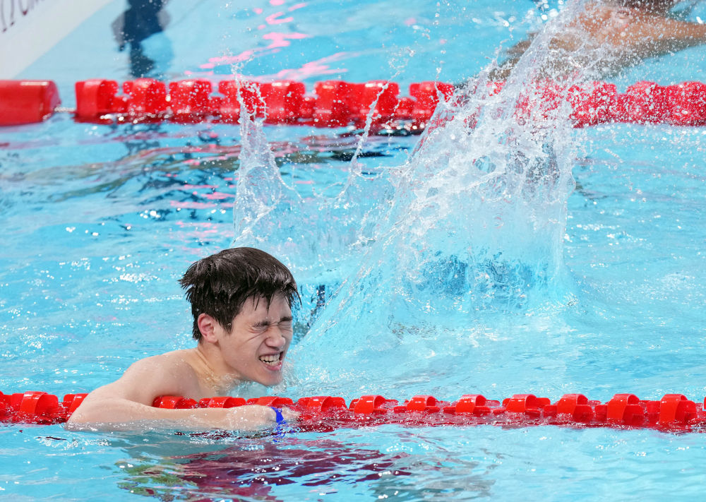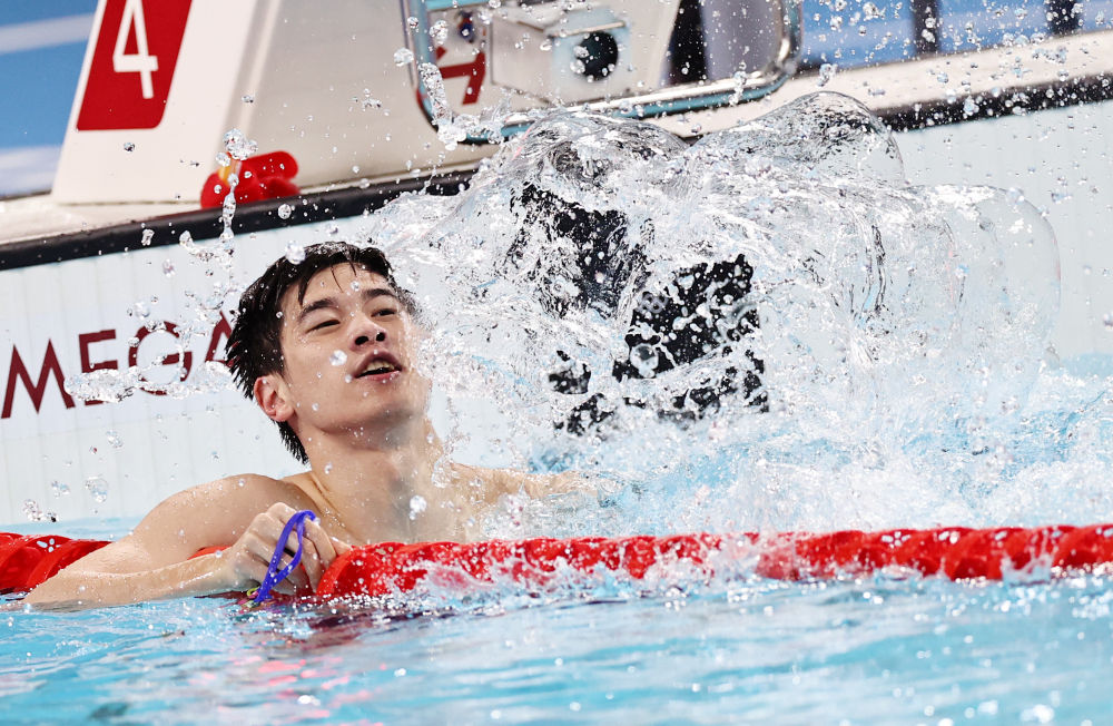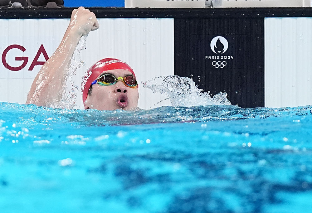 ↑中國選手潘展樂在比賽后慶祝。新華社記者 薛宇舸 攝