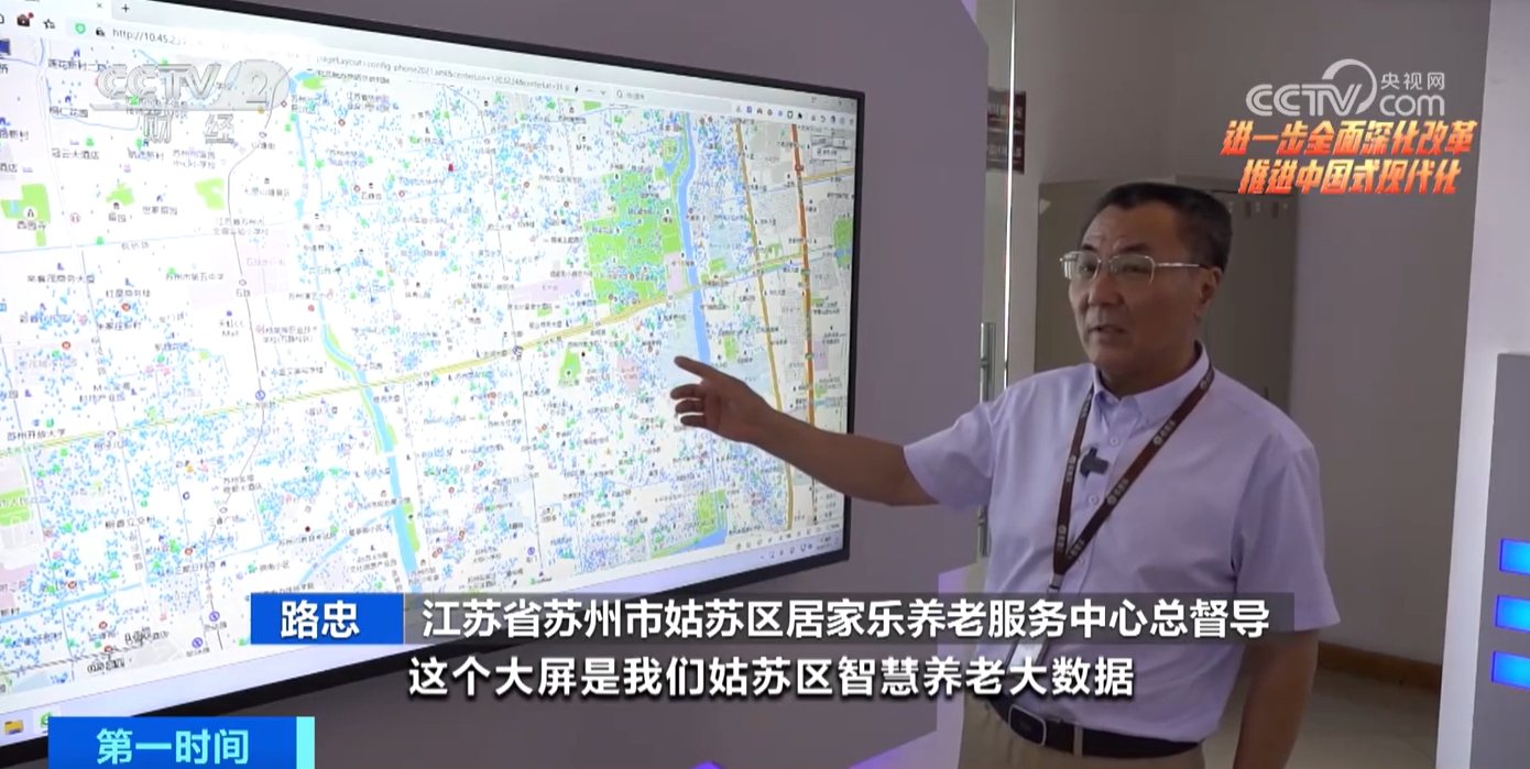 江蘇蘇州姑蘇區(qū)居家樂養(yǎng)老服務(wù)中心總督導(dǎo)路忠介紹,這個大屏是姑蘇區(qū)智慧養(yǎng)老大數(shù)據(jù)在線實時的數(shù)字地圖,粉色的點就是現(xiàn)在正在服務(wù)中的284戶老人,綠色的點位就是現(xiàn)在還有900多個老人在等待著上門服務(wù),大量的藍(lán)色的小點是服務(wù)用戶,是整個“虛擬養(yǎng)老院”的老人。