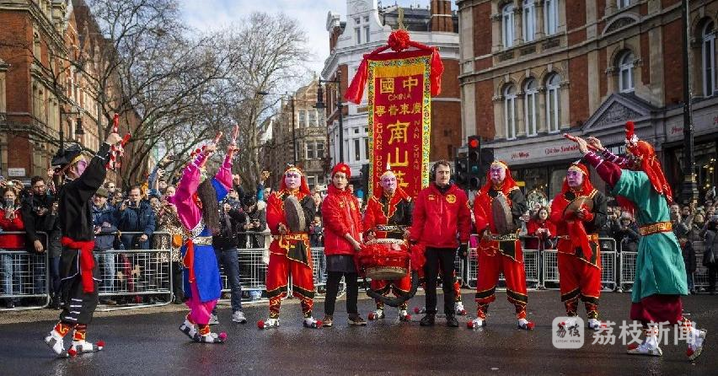當(dāng)?shù)貢r(shí)間 2024 年 2 月 11 日,陳來發(fā)教練率領(lǐng)廣東普寧南山英歌隊(duì)的近 20 名舞者現(xiàn)身英國倫敦,揭開了當(dāng)?shù)匦麓簯c典的帷幕,這也是普寧英歌首次出海。與此同時(shí),千里之外的普寧市內(nèi)另有一支南山英歌隊(duì)伍正穿梭于街巷,為市民驅(qū)邪扶正,帶隊(duì)者之一正是陳揚(yáng)波。