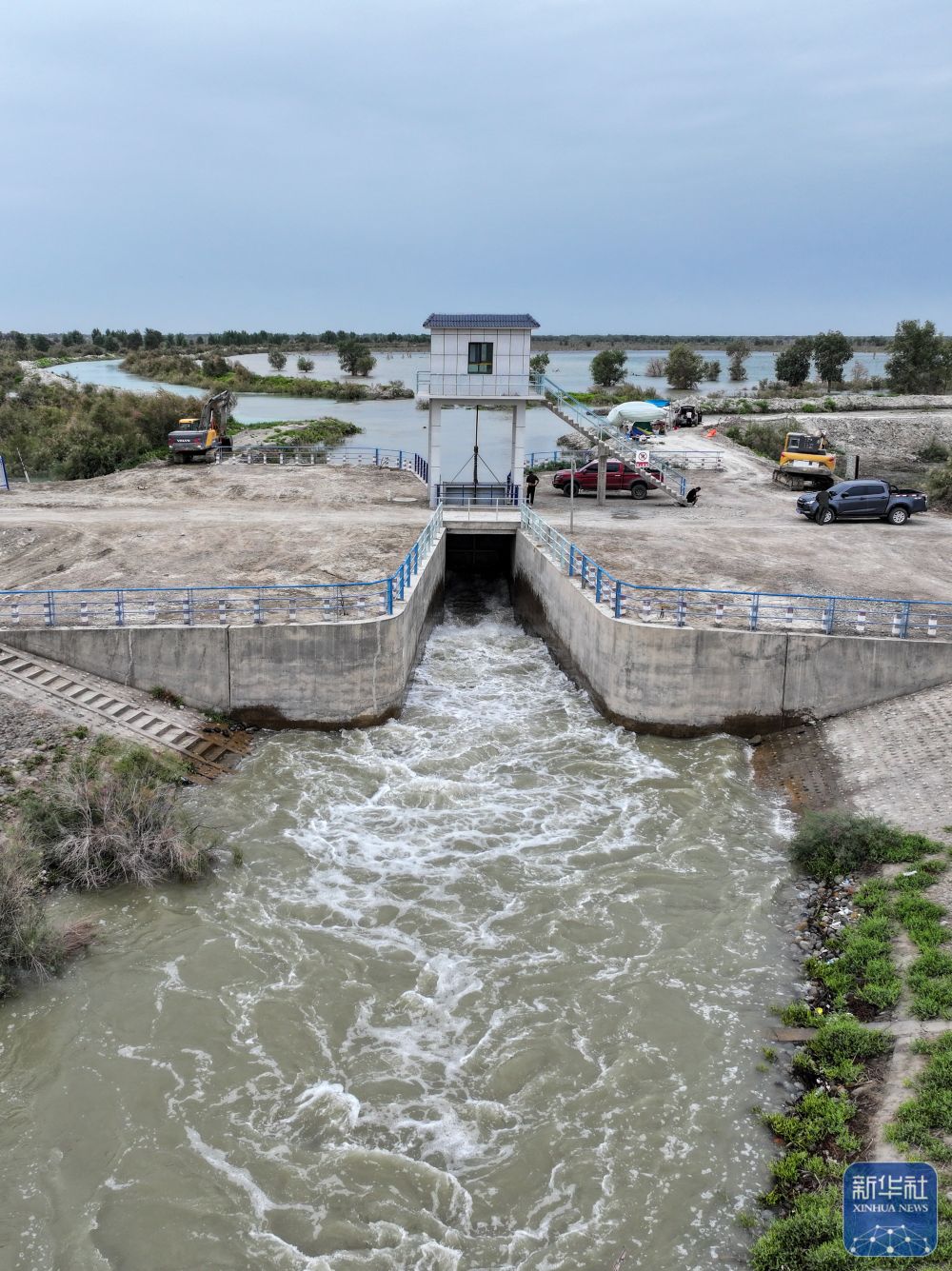 ↑在新疆阿克蘇地區(qū)沙雅縣蓋孜庫木鄉(xiāng),一處生態(tài)閘在進行引洪灌溉胡楊林(8月4日攝,無人機照片)。