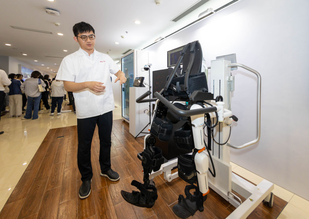 2024年5月24日,在位于上海市嘉定區(qū)的上海交通大學醫(yī)學院附屬瑞金醫(yī)院腫瘤質(zhì)子中心,工作人員介紹由瑞金醫(yī)院醫(yī)生和醫(yī)療公司共同研發(fā)的用于恢復(fù)患者下肢的醫(yī)療機器人。新華社記者 王翔 攝