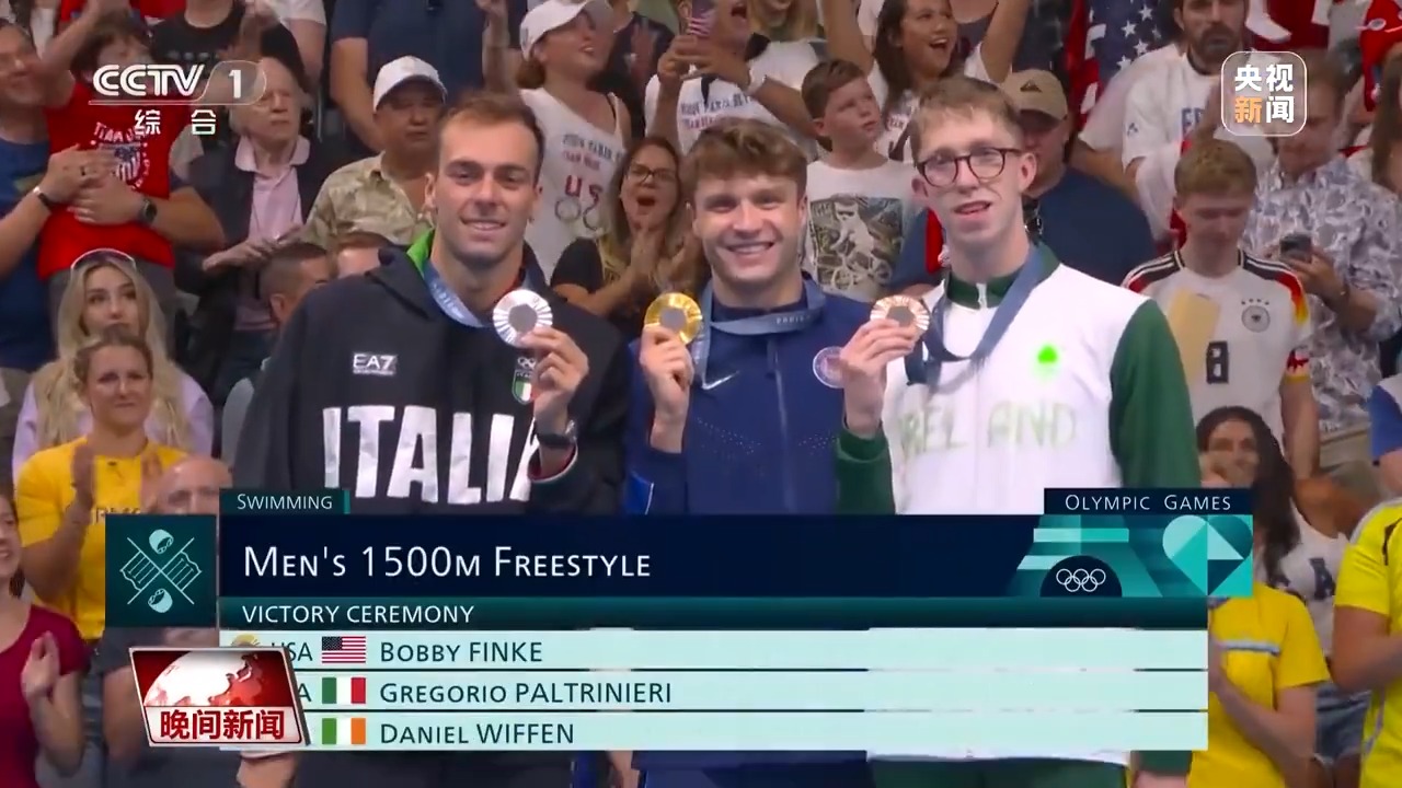 游泳項目,速度比拼。男子1500米自由泳決賽,身處第7道的美國選手芬克,從一入水就處于領先的位置,最終以14分30秒67觸壁,獲得冠軍的同時,也打破了世界紀錄。