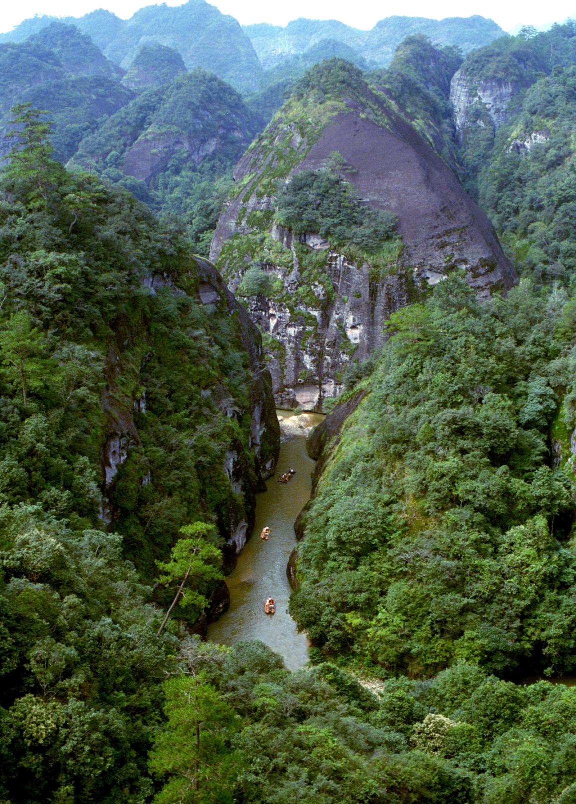一下、一下、又一下!隨著排工在溪水里劃動竹竿,竹排動力十足地乘水漂流。隨即,排工在排上唱起韻味十足的山歌,歌聲悠揚,回響在溪水如碧的峽谷間。兩岸石壁峭立,因不同的風化程度呈現(xiàn)各異奇觀,盡顯大自然的鬼斧神工。有著“九十九曲,八十八灘”美名的上清溪位于福建省三明市泰寧縣,宛若一條蛟龍,盤踞在深山幽谷中,纏繞于赤壁丹崖間。