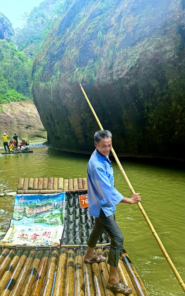 “我們一趟就要撐萬把下竹竿,一年下來要撐三百多萬下?!备闪?5年的上清溪排工黃盛騰談起他的排工生活,幽默風趣,“上清溪全長16.5公里,落差比較大,排走得比較緩慢一些,那就比較吃力一些,所以說我們的工人叫‘吃飽了撐著’?!?/p>