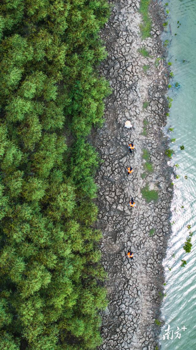 說話間,大家伙各就各位、有序分工,拍照的拍照、記錄的記錄?!皹鋵殞殹迸浜系嘏排帕⒄?,在風中“搖頭晃腦”。此時,“技術控”李明霖飛起一架無人機,從高空拍下“大合影”和視頻,解釋道:“后續(xù)還要比對片區(qū)紅樹林總體長勢變化?!?/strong>