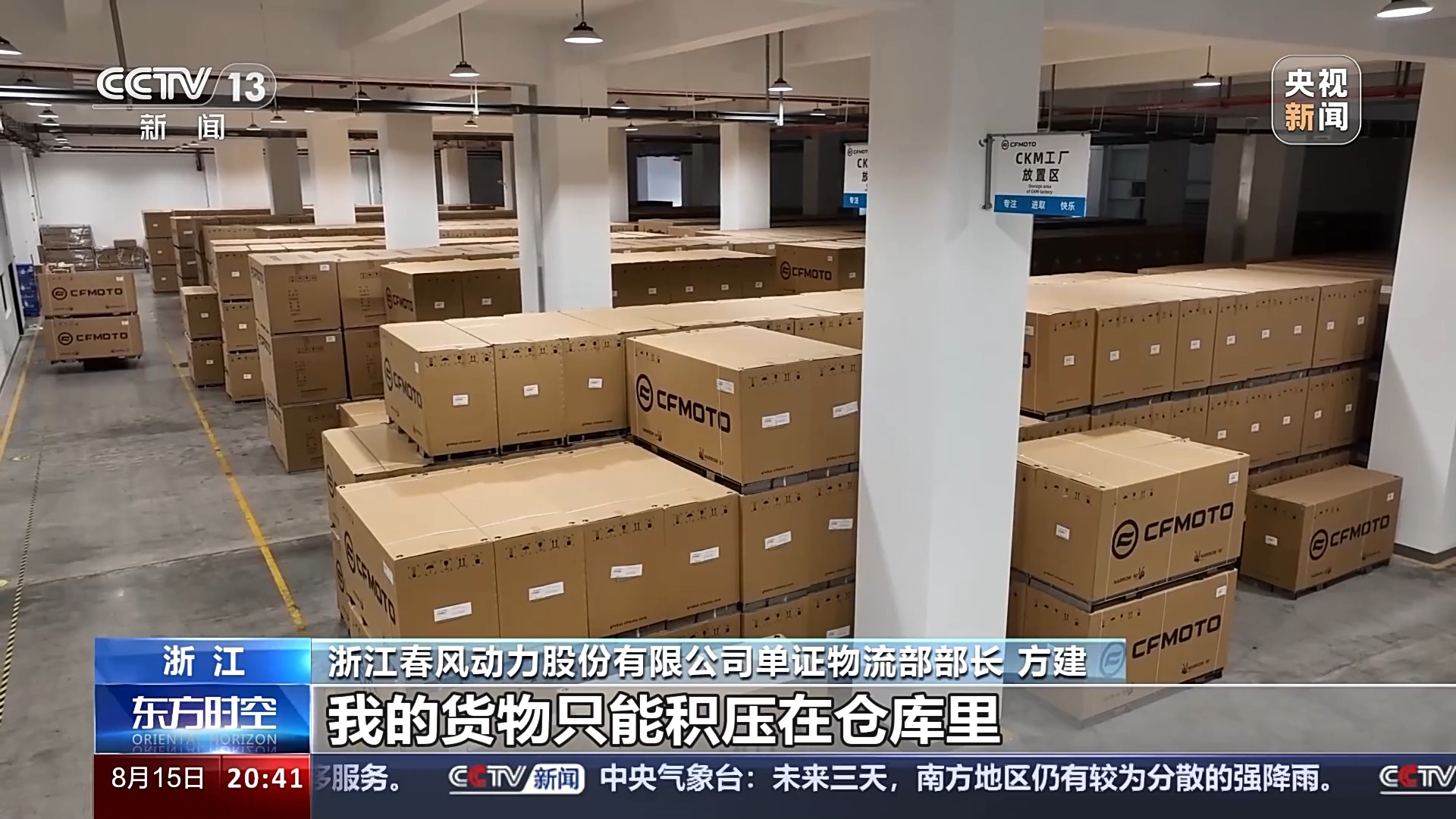 浙江春風(fēng)動力股份有限公司單證物流部部長 方建:因?yàn)橥赓Q(mào)訂單是在手的,然后生產(chǎn)線也是不停的。如果說貨物出口沒有集裝箱的話,我的貨物只能積壓在倉庫里。